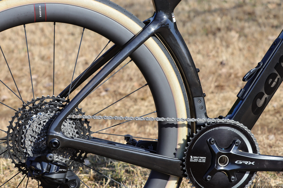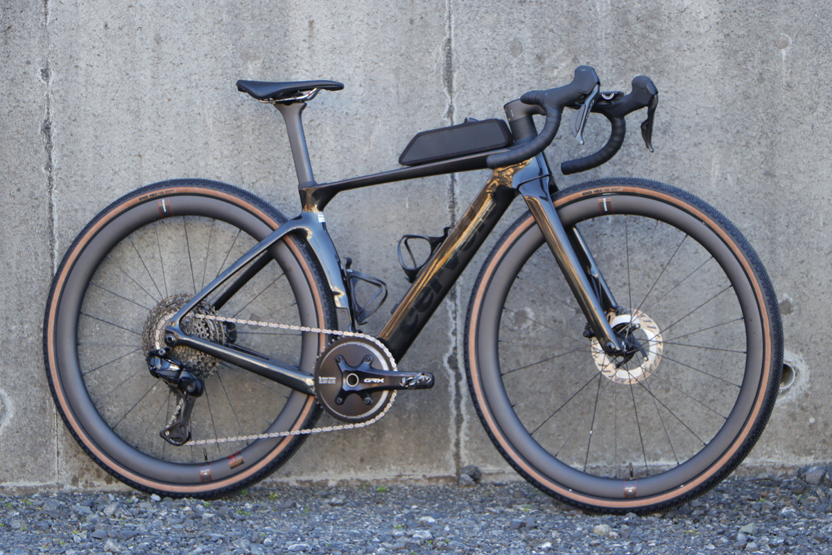 インプレするモデルはシマノGRX Di2の1✕(フロントシングル)仕様にリザーブ40/44GRホイールがセットされた完成車。GRX RX825リアディレイラーにXTRのスプロケット、GRXクランクにウルフトゥースのエアロ形状48Tシングルギアがセットされるというグラベルレーシング仕様。タイヤにはヴィットリアCorsa Pro Control 42Cがセットされ、デフォルトではオンロード向けセッティングの完成車となっている。