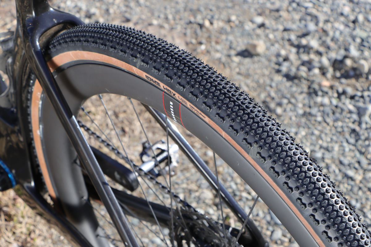 そしてグラベルタイヤに履き替えて走ってみる。セットしたタイヤはENVEがグラベルレース用に開発したHEXの40C。日本でポピュラーなタイヤではないが、レースで速く走ることをターゲットに設計されたレーシングタイヤ。
