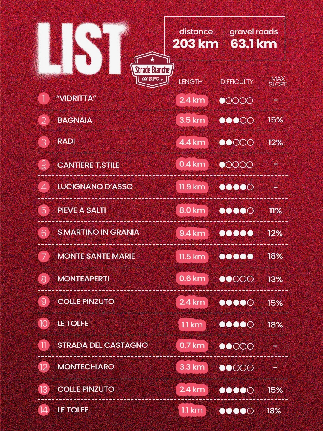 未舗装路セクター一覧 image:RCS Media group ティレーノ〜アドリアティコの調整レース、そして2週間後に行われるモニュメントの第1戦、ミラノ〜サンレモの前哨戦に位置づけられていたのは今や昔。2007年に初開催され、2017年にUCIワールドツアーに昇格した後発レースにもかかわらず、イタリア・トスカーナの丘陵地帯に広がる未舗装路を、白い土埃を上げながら進むプロトンは、もはや春のクラシックシーズンのハイライトの1つとなった。