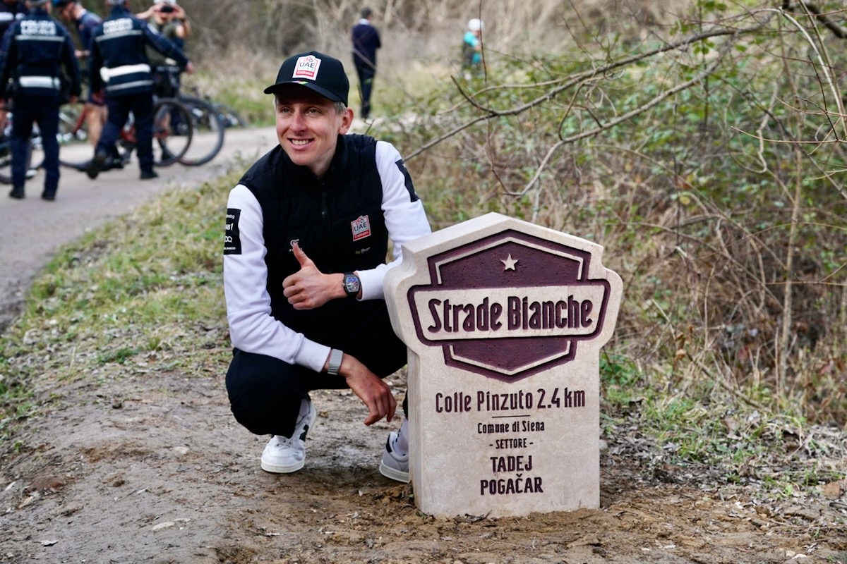 今年も例年同様、主要レースのプレビューはポガチャルの名前から始まる。1998年生まれでまだ27歳の世界王者は、これが今季初レース。だからといってコンディションが整っていないという杞憂は、同じくシーズン初戦で81km独走を決めた2024年に払拭済み。3月5日(木)に試走を行い、フィニッシュ地点までたどり着いた後、今大会9つめの未舗装路「コッレ・ピンツート」に戻り、3勝を称える「タデイ・ポガチャル・セクター」と名付けられた記念石の設置を喜んだ。