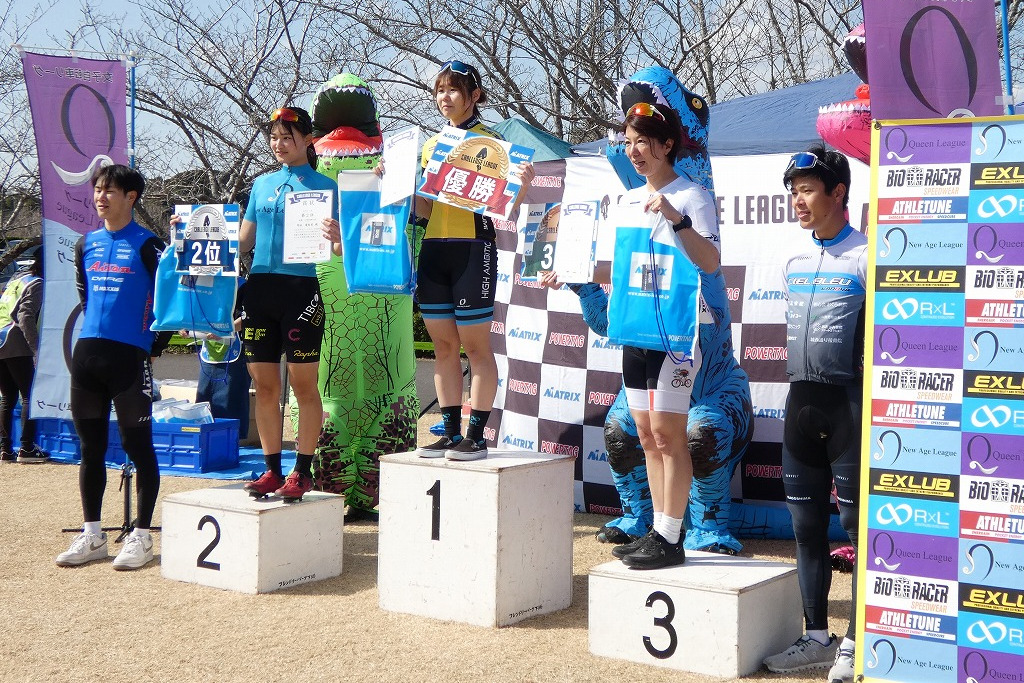 プレゼンターのゲスト織田聖(愛三工業レーシング:左端)と岡崎一輝(シエルブルー鹿屋:右端)に祝福されるレディースレース上位3名。左2人目から2位・岡田、優勝の岡本、3位・根本 photo:QNリーグ事務局