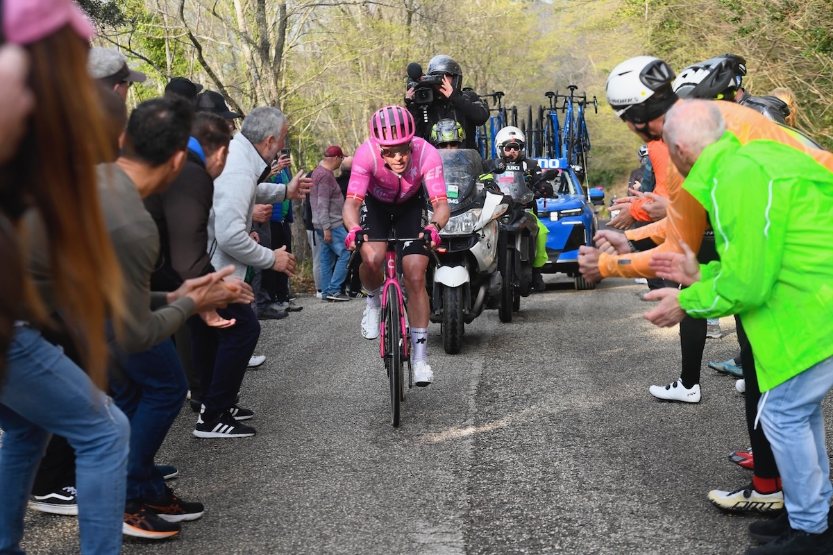 残り30km地点で逃げは6名に絞られ、登り区間でのアタック合戦が始まる。先頭からミケル・ヴァルグレン(デンマーク、EFエデュケーション・イージーポスト)が飛び出すと、アラフィリップしかついていけない。一方、さらにスピードを増したプロトンからは総合10位のアントニオ・ティベーリ(イタリア、バーレーン・ヴィクトリアス)が遅れ、総合から脱落。そしてこの日最後の山岳、サントゥアリオ・デル・ベアート・サンテに入り、ヴァルグレンがアタックした。