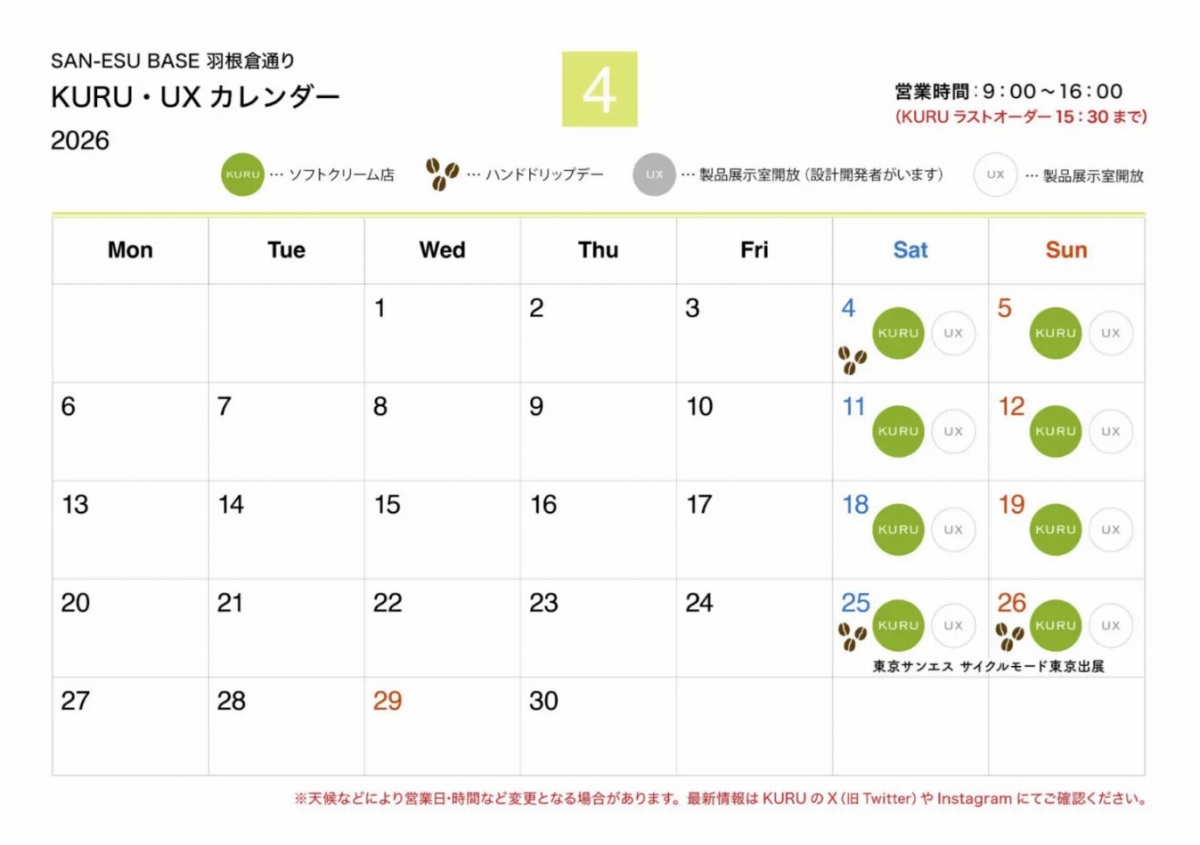 サンエスベース羽根倉通りのソフトクリーム店「KURU」と製品展示室である「UX」ルームのカレンダーとなります。