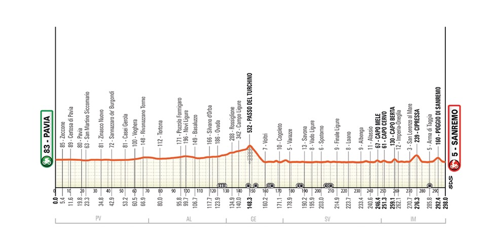 パレード走行を含めると300kmに迫るコース(298km)は、その名の通りイタリア北部のミラノからサンレモまで。昨年同様にミラノ近郊のパヴィーアを出発し、ロンバルディア平原を駆ける前半部は平坦路が続く。残り149.3km地点に頂上が置かれたトゥルキーノ峠を越えると、リグーリア海へと出る。