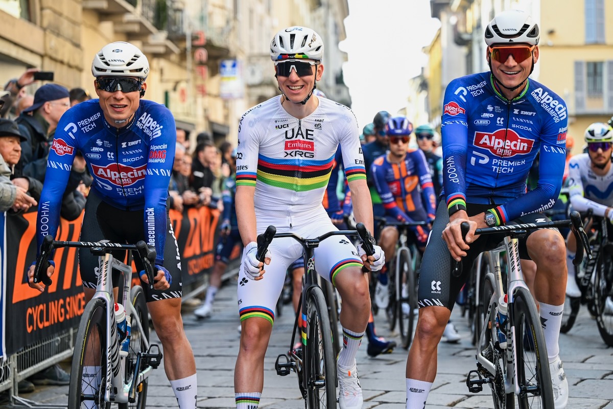 2024年覇者フィリプセンと2023、25年覇者ファンデルプールの間でスタートを待つタデイ・ポガチャル(スロベニア、UAEチームエミレーツXRG) photo:CorVos