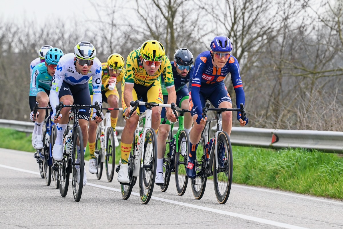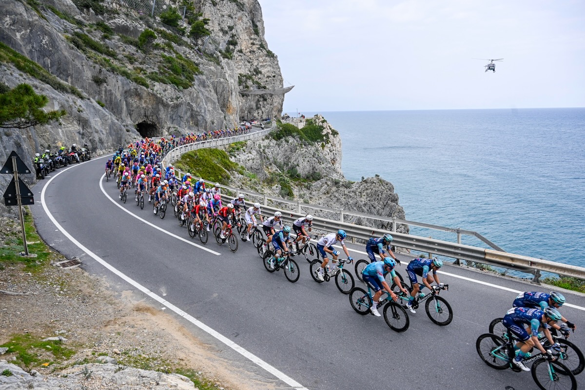 そのプロトンでは、タデイ・ポガチャル(スロベニア、UAEチームエミレーツXRG)のチームメイトであるヤン・クリステン(スイス)が落車する。そこにモビスターのエーススプリンターであるオールイス・アウラール(ベネズエラ)も巻き込まれ、2名は早々とレースを去った。その後、逃げのリードは3分から2分半の間で推移し、トゥルキーノ峠でリグーリア海岸沿いに出ると、プロトンはレッドブル・ボーラ・ハンスグローエやピナレロQ36.5プロサイクリングなども集団牽引に選手を送った。
