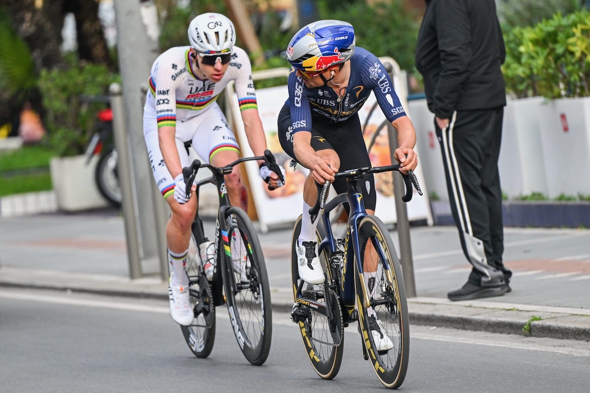 ハンドルを投げるタデイ・ポガチャル(スロベニア、UAEチームエミレーツXRG)とトーマス・ピドコック(イギリス、ピナレロQ36.5プロサイクリング) photo:CorVos
