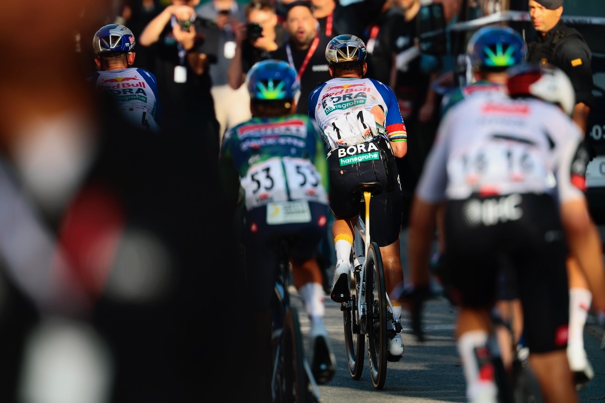 その後はレッドブル・ボーラ・ハンスグローエやヴィスマ・リースアバイクを中心に集団を牽引し、最後の3級山岳を越えて逃げを引き戻す。そしてその下りでは横風による集団分断(エシュロン)が発生。特にレッドブルは分断を狙うべくスピードを上げ、残り28.4km地点でレムコ・エヴェネプール(ベルギー、レッドブル・ボーラ・ハンスグローエ)が飛び出した。