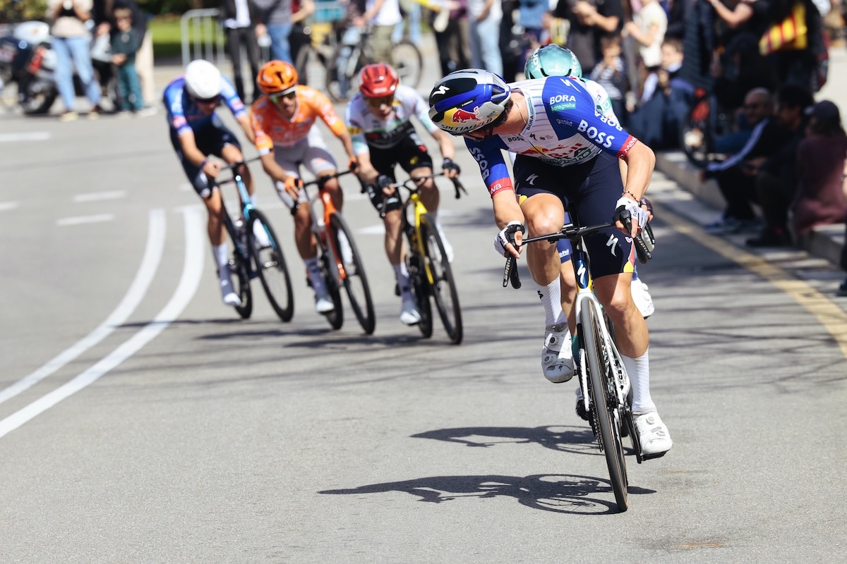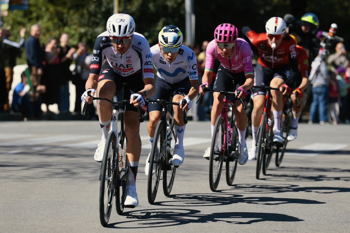 序盤から第2ステージ勝者、マグナス・コルト(デンマーク、ウノエックス・モビリティ)が入った逃げグループは5名。ブランドン・マクナルティ(アメリカ、UAEチームエミレーツXRG)など強力なメンバーを追うメイン集団は、リーダーチームのヴィスマ・リースアバイクではなく、レムコ・エヴェネプール(ベルギー)のステージ優勝を狙うレッドブル・ボーラ・ハンスグローエが牽引した。2分あったリードは徐々に縮まり、周回コースに入る頃にはその差は1分まで縮まっていた。