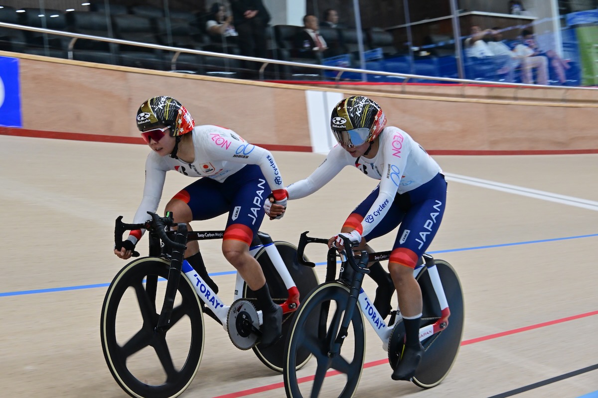 さらに垣田真穂・池田瑞紀ペアで挑んだ女子マディソン(120周30km)でも、スプリント周回で中国、香港と1位(5ポイント)を分けあいながら展開しつつ、中国を相手に後半戦にかけてポイントを積み重ねて優勝、金メダル獲得を果たした。