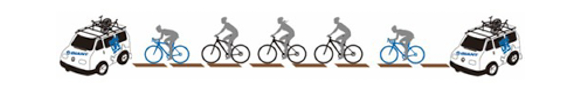 2台の車両がツアーに帯同。飲食物を常時提供し、参加者の手回り品やスーツケース、スペアバイク等を積載。参加者はボトル1本だけで安心して軽快に走行可能。充実した「補給食」が大好評。
