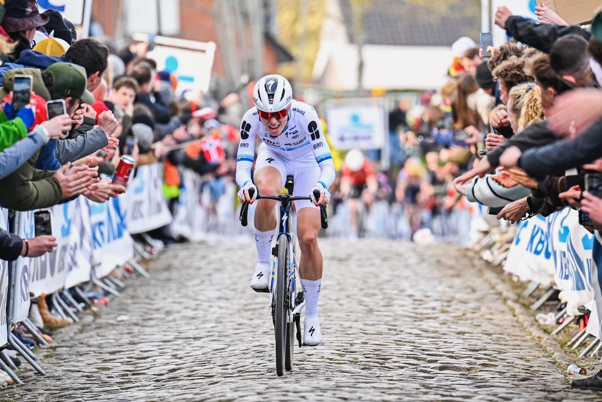 ヨーロッパ王者を表す、ヘルメットからシューズまで全身白地のウェアに身を包んだフォレリングは、シッティングのままグイグイと石畳坂でバイクを進める。その圧倒的なスピードにはコペッキーやプック・ピーテルセ(オランダ、フェニックス・プレミアテック)はついていけず、辛うじて食らいつくフェランプレヴォも徐々に引き離されていく。