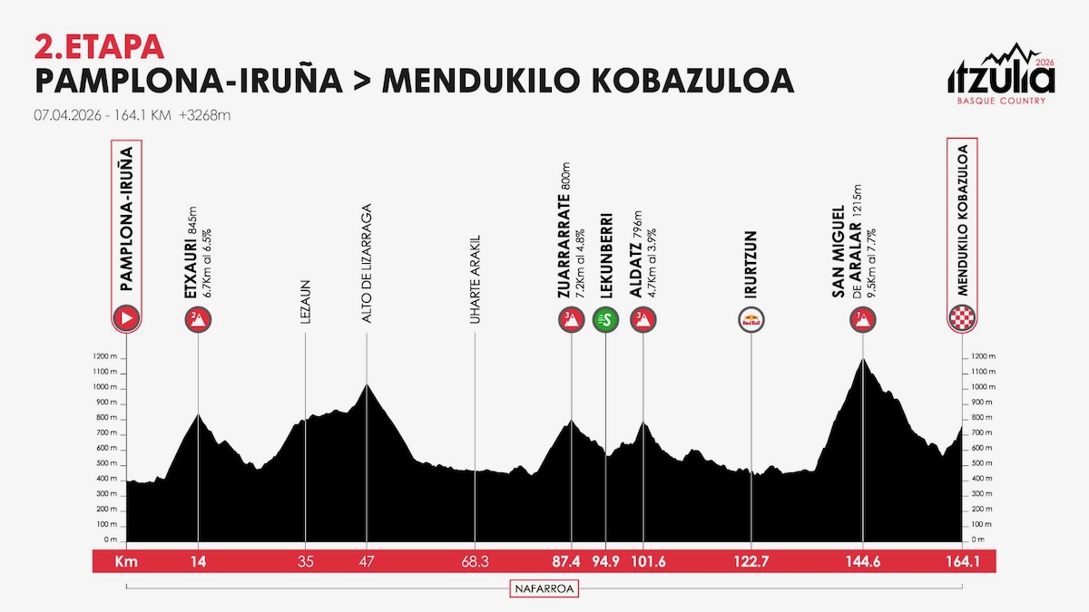 イツリア・バスクカントリー第2ステージ image:Itzulia Basque Country フランスの新星が初日の個人タイムトライアルで強豪を退けたイツリア・バスクカントリー(UCIワールドツアー)。大会2日目はパンプローナを出発し、山岳地帯を巡る164.1kmで争われた。終盤には1級山岳サン・ミゲル・デ・アララル(距離9.5km/平均7.7%)が登場。ただ、フィニッシュ地点は頂上ではなく、下ってから約1kmの急坂を登り返した先に設定された。