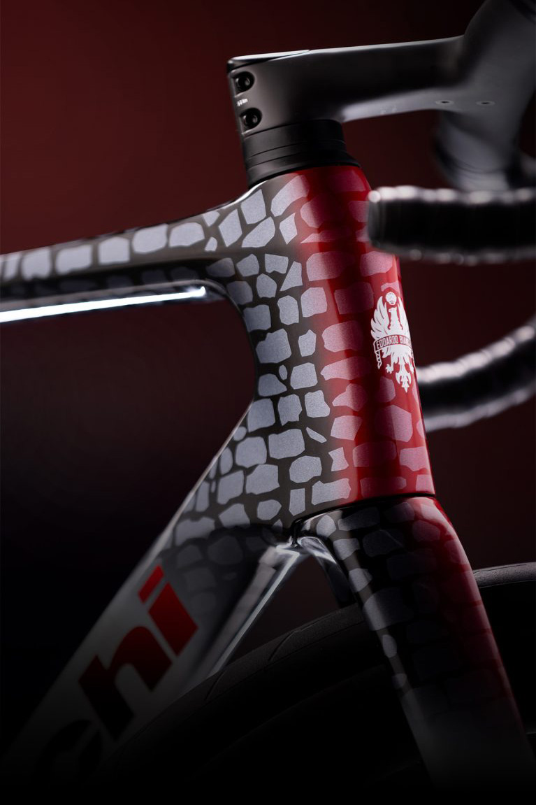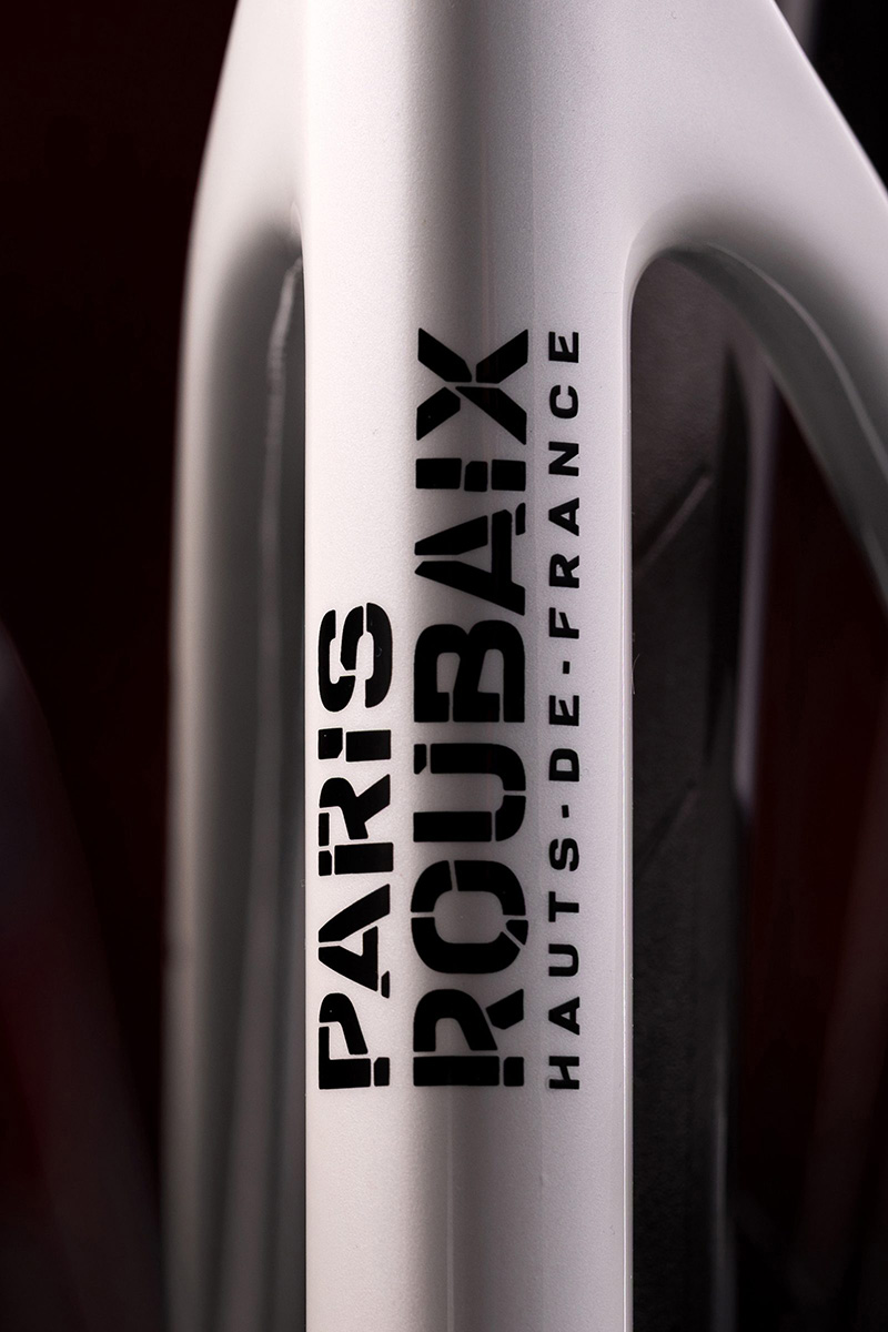 特別仕様のINFINITOは、記念モデルにふさわしい華やかさが演出されている。ホワイト、レッド、ブラックを基調としたカラーリングは一台一台ハンドペイントで仕上げられ、フォーク、ヘッドチューブ、トップチューブ、ダウンチューブにかけて石畳をモチーフにしたグラフィックが大胆にあしらわれている。シートチューブにはパリ〜ルーベのロゴ、ボトムブラケット付近にはシリアルナンバーも配される。
