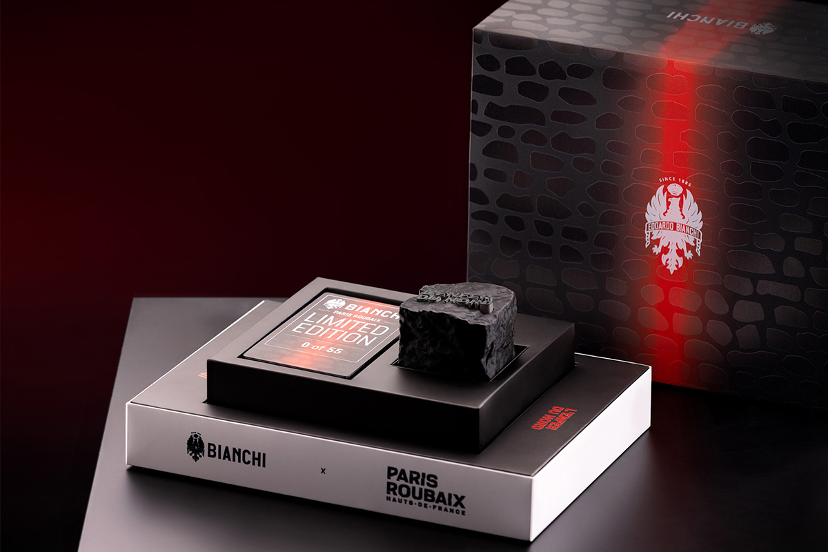 専用キットが付属する点も見逃せない。石畳をモチーフにしたキューブ型パッケージのなかには、オーナーシップカード、石畳風カードホルダー、専用バイクカバー、そしてビアンキCEOアルベルト・カヴァッジョーニ氏の直筆サイン入り認定証が収められる。