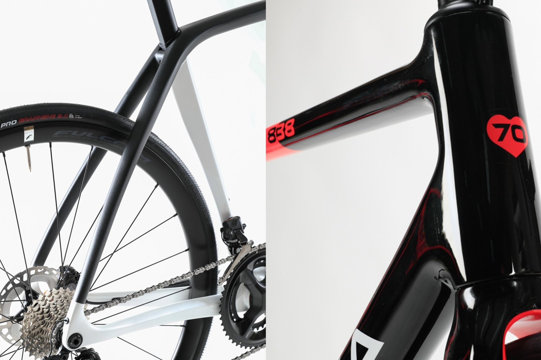 展示&試乗車は、Black Red Glossyカラーの105 Di2 12s完成車モデル。46、50、52の3サイズをご用意します。