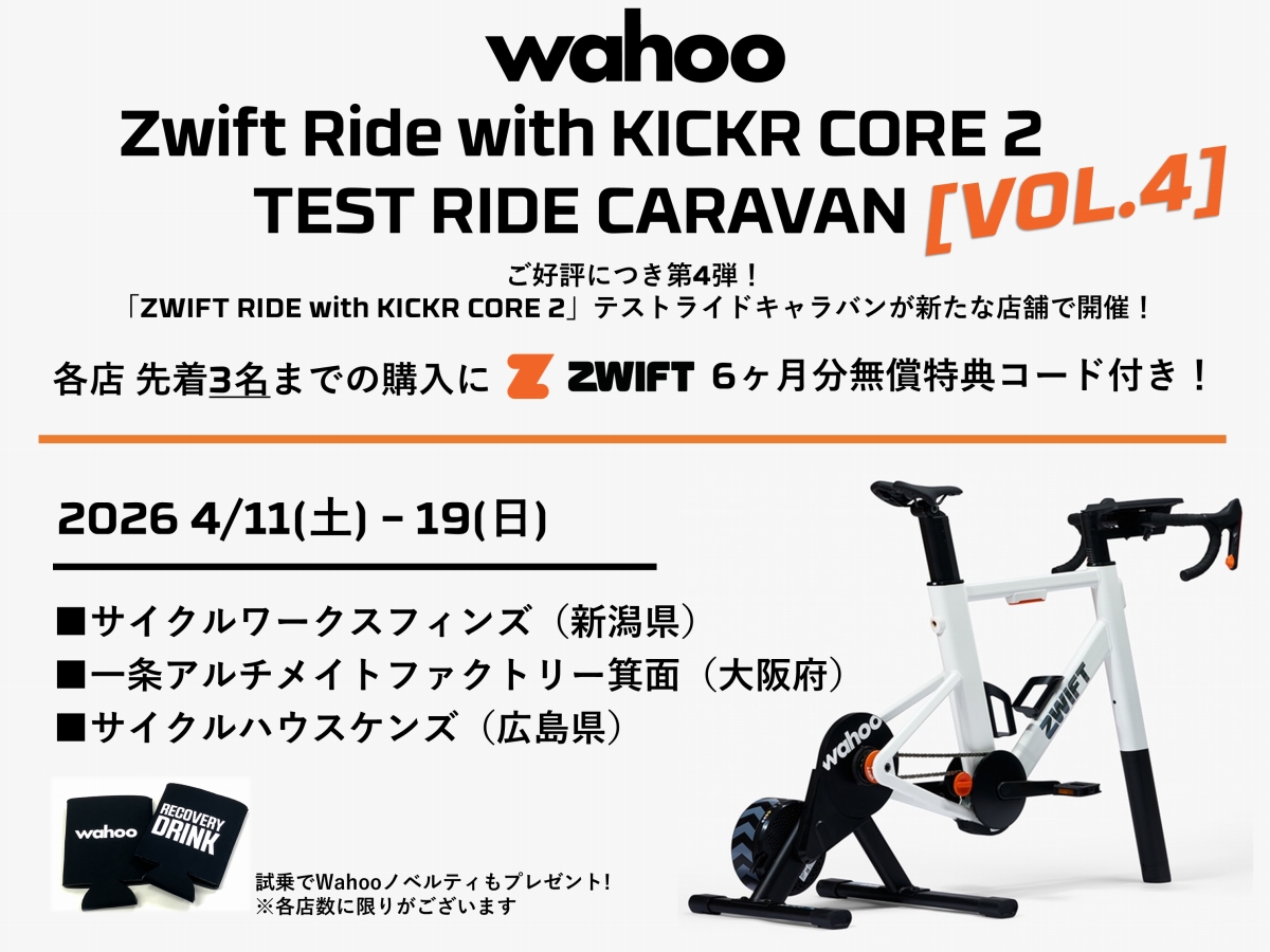 ワフーが「ZWIFT RIDE with KICKR CORE 2 CARAVAN Vol.4体験キャラバン」を全国のワフーディーラーの一部店舗で開催する。ZWIFT RIDE with KICKR CORE 2を実際に見て、触って、試せる機会だ。期間は4月11日(土)~19日(日)まで。以下、プレスリリースより紹介しよう。