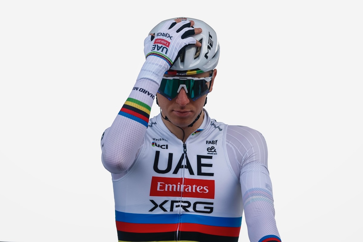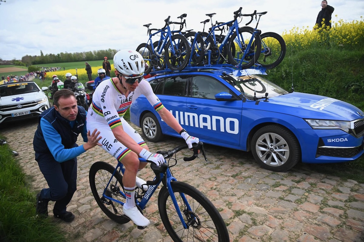 この日は特に有力選手たちのパンクが頻発した。まず最初にマッズ・ピーダスン(デンマーク、リドル・トレック)がパンクで遅れ、直後にワウト・ファンアールト(ベルギー、ヴィスマ・リースアバイク)もパンク。その約20km後には、世界王者の証、アルカンシエルジャージを着るタデイ・ポガチャル(スロベニア、UAEチームエミレーツXRG)もパンクでスペアバイクを待つ。しかしチームカーはすぐには到着せず、渡されたニュートラルバイクに跨り前を追いかけた。