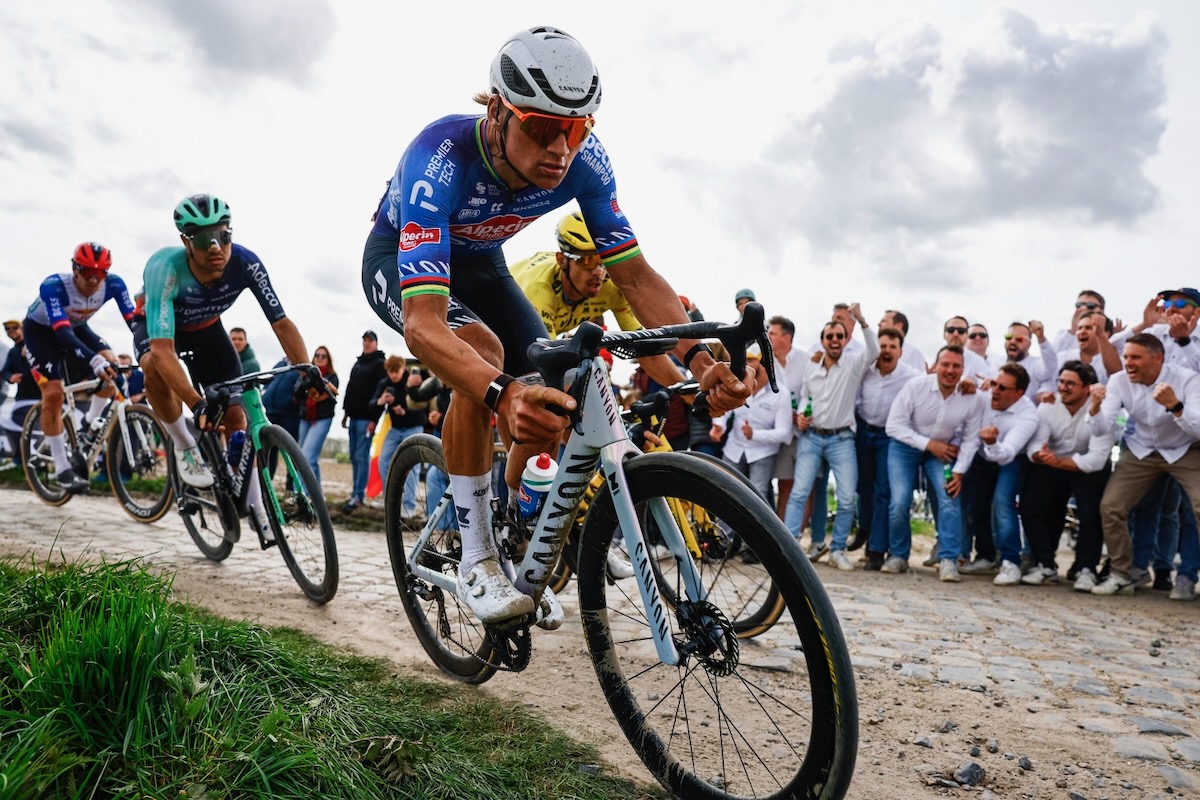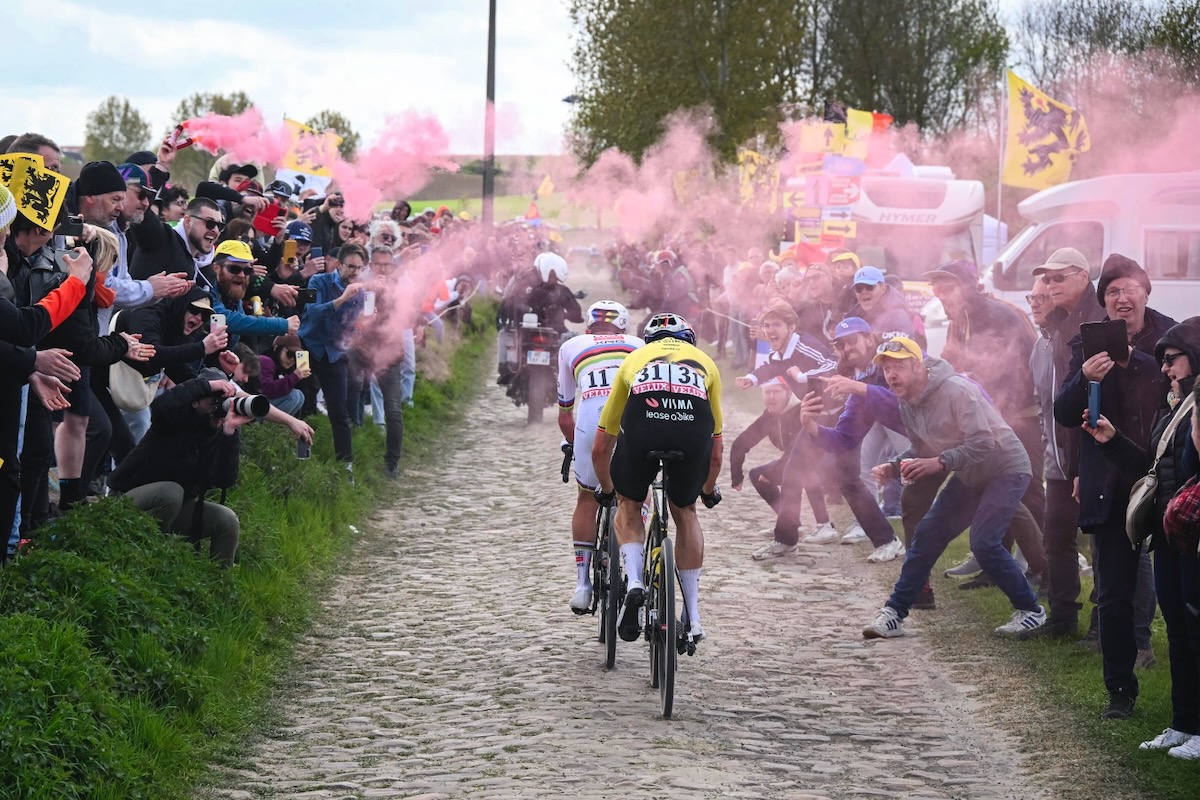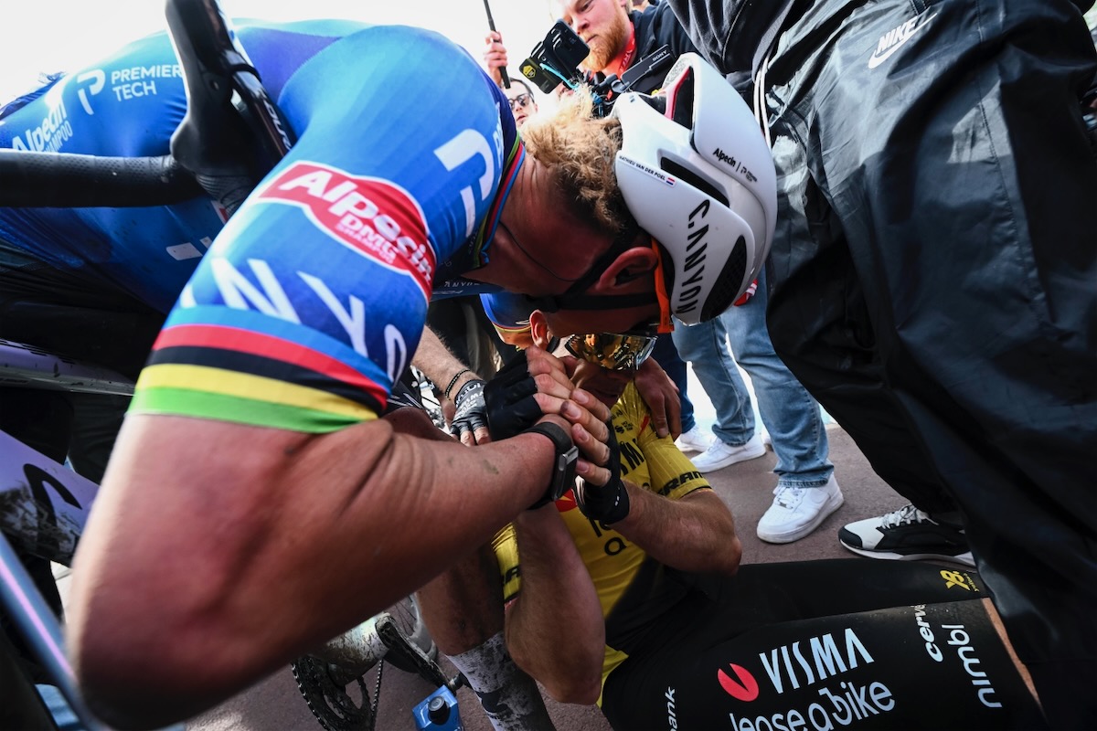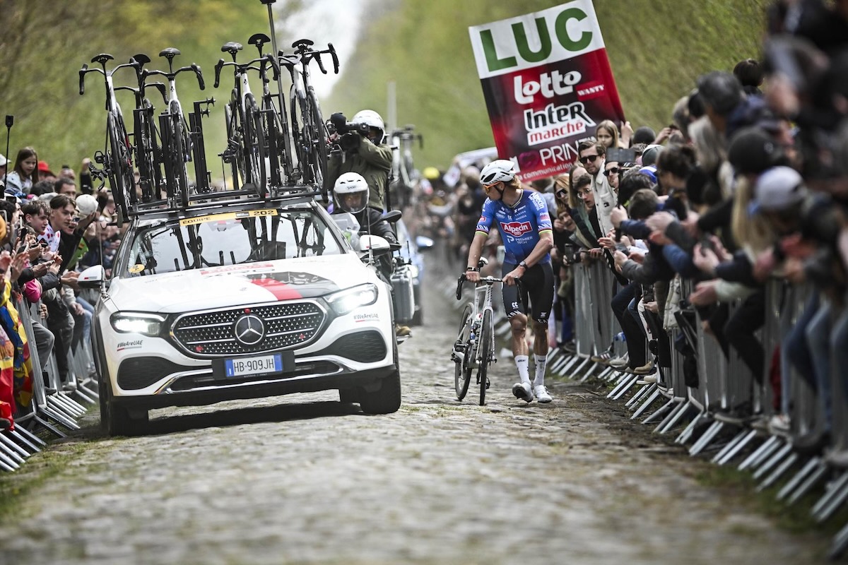 しばらく走ったのち、ようやく代わりのバイクを受け取ったポガチャルを、チームメイトが総出で牽引。3名のアシストを使ったポガチャルは、残り98km地点でヴィスマ・リースアバイクが先導する先頭集団に合流を果たす。そしてこの日1つ目の最高難易度である5つ星セクター「No.19 アランベール」に突入。大会を象徴する総距離2.3kmの石畳区間では、ファンアールトが自ら先頭を走る一方、マチュー・ファンデルプール(オランダ、アルペシン・プレミアテック)がパンクに見舞われた。