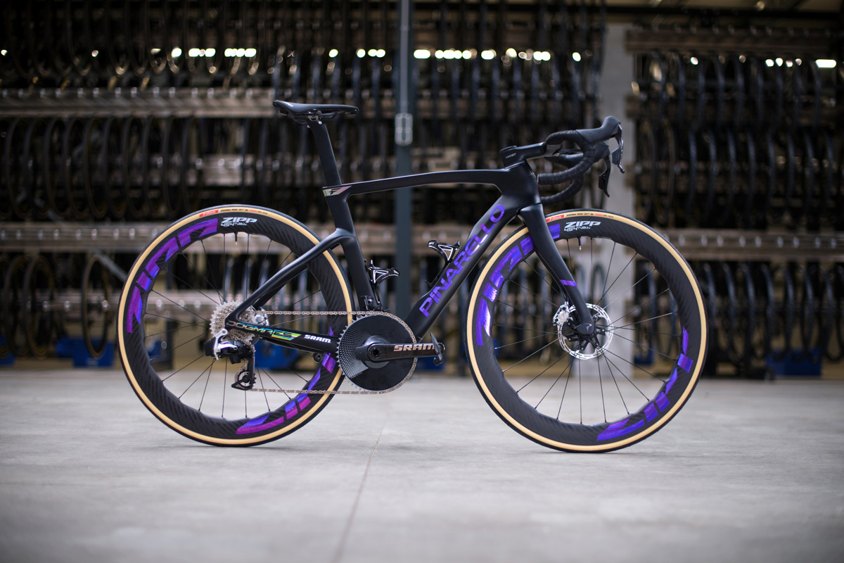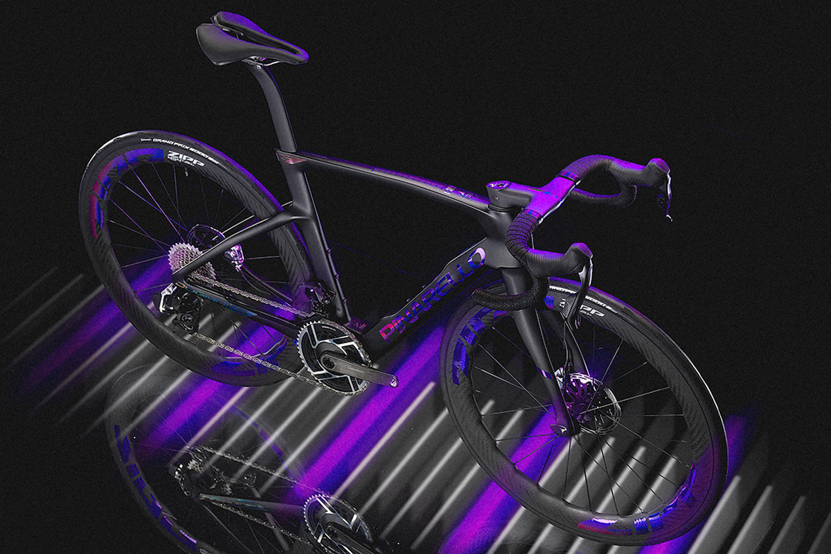 トップチューブにはピナレロとティソのロックアップロゴと、時間の流れをモチーフにしたグラフィックが描かれる。マッチするジップ 454 NSWホイールにもフレームと同じホログラムパープルのデカールが入り、車体全体で統一感のあるグラフィック表現にまとめられている。
