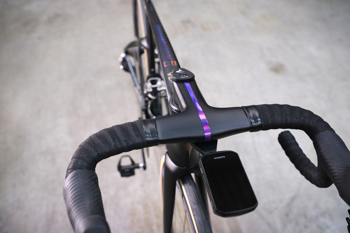 ティソエディションのDOGMA Fは、このコラボレーションのためだけに仕立てられたカーボンマットのカラーリングが施される。ダウンチューブ、シートチューブ、チェーンステーには、見る角度によって表情を変えるホログラムパープルとミラー仕上げのデカールがあしらわれ、マットフレームにアクセントが加えられた。
