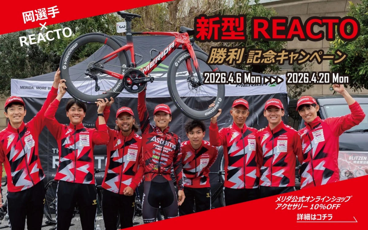 第3回NTT東日本宇都宮清原クリテリウムでAstemo宇都宮ブリッツェンの岡篤志が新型REACTOで優勝したことを記念するキャンペーンがメリダ公式オンラインショップで開催中。アクセサリー商品が全品10%OFFになる機会だ。以下、プレスリリースより紹介しよう。