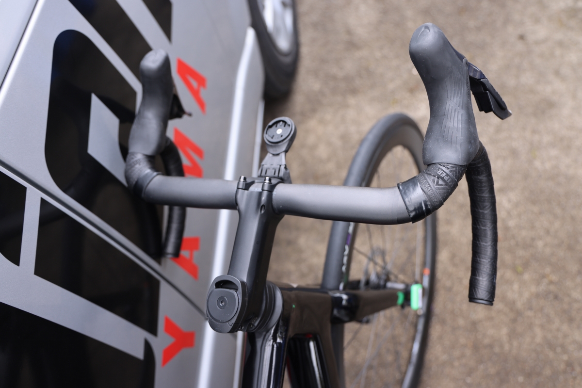 ベースはジャイアント TCR Advanced Pro 0のULTEGRA完成車であるため、コンポーネントはシマノ ULTEGRA DI2で統一されている。ギア比はフロントが54-40T、リアのスプロケットは11-34T。ハンドルはジャイアント Contact SLRで、ハンドル幅は上が390mmでフレアして420mm、ステムはジャイアント Contact SL AeroLightの90mmだ。