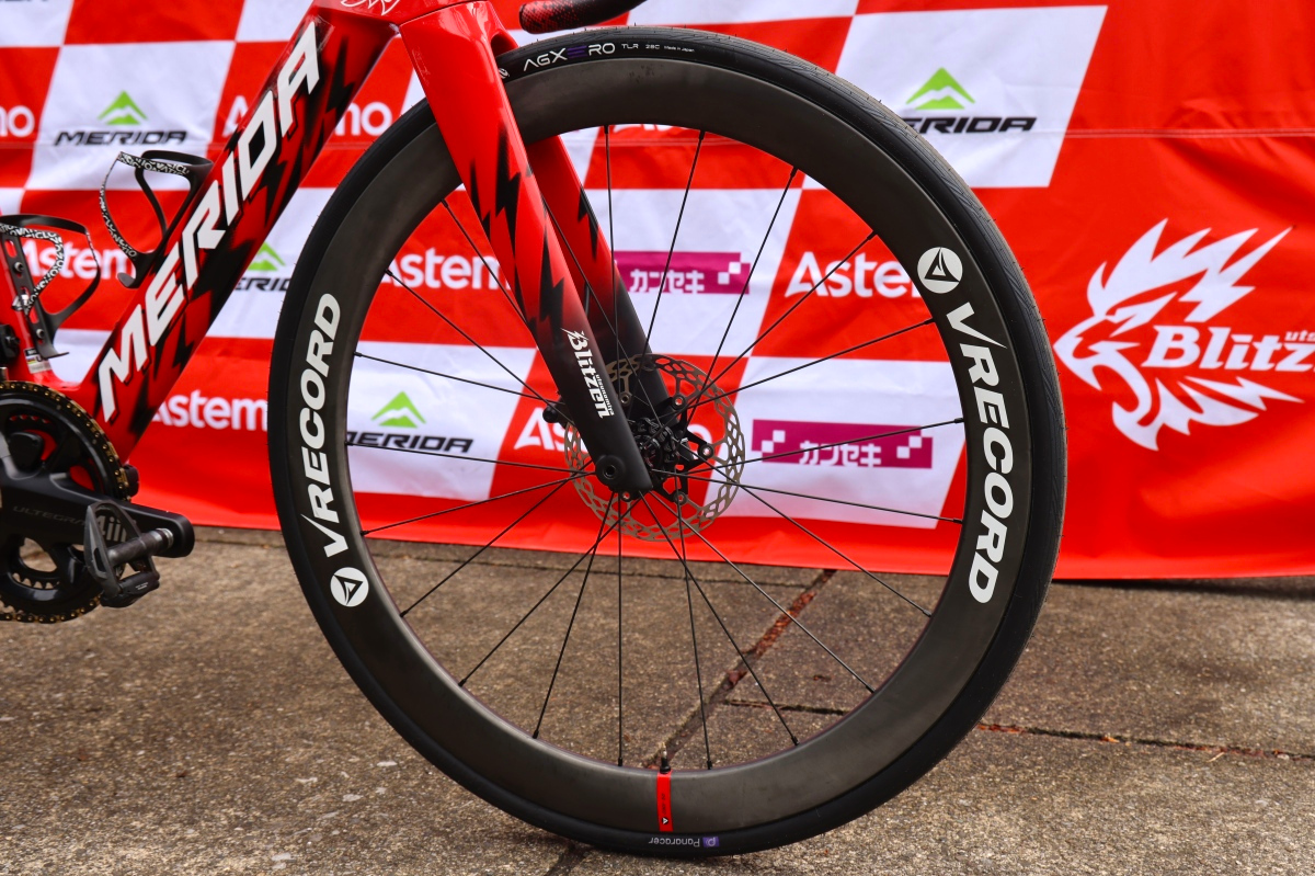 ホイールはブリッツェンが手がける新興パーツブランド、VRECORD(ブイレコード)のオールラウンドモデル”VRECO ONE 50”を使用。タイヤは全選手がパナレーサーの新型レーシングタイヤ「AGXERO」の28Cを使用していた。