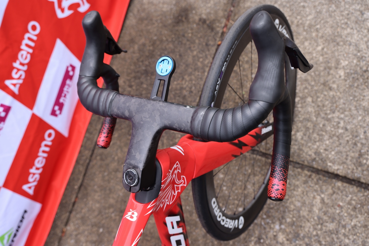 ハンドルはVRECORDの一体型カーボンハンドルのプロトタイプが取り付けられ、シクロベーションのバーテープが巻かれる。サドルはプロロゴで、3DプリントパッドモデルやSCRATCHなど、選手によって異なるモデルを使用していた。