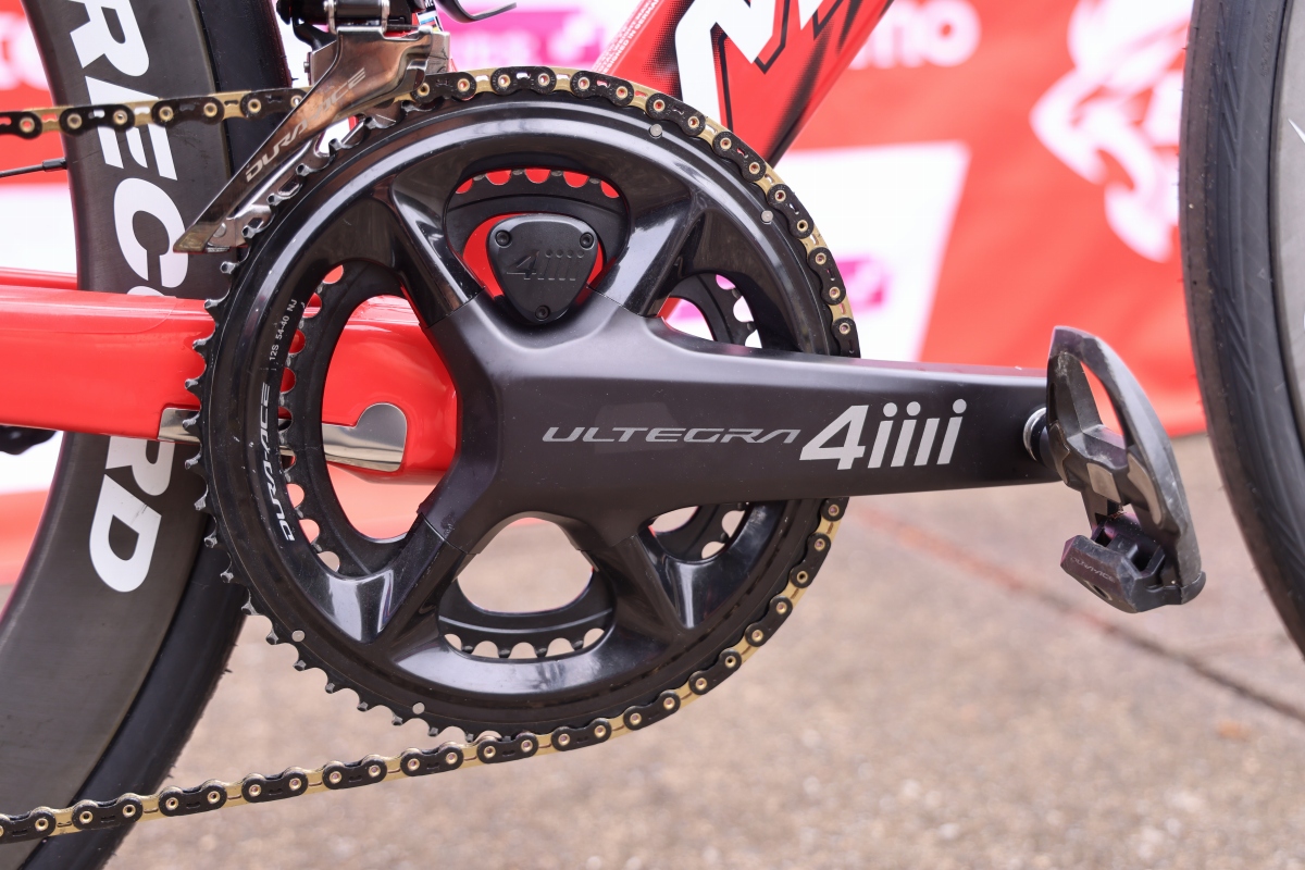 コンポーネントはシマノ DURA-ACEとULTEGRAをミックスして使用。今シーズンからドライブトレイン周りのサプライヤーが新しくなり、4iiii 両足計測のクランク型パワーメーターをはじめ、SUMCのチェーン、トライピークのビッグプーリー、ライデアのフロントチェーンリングを使用している。