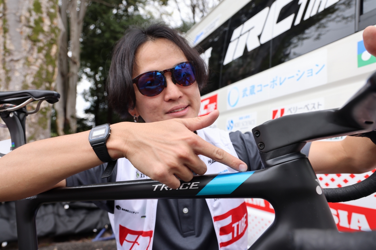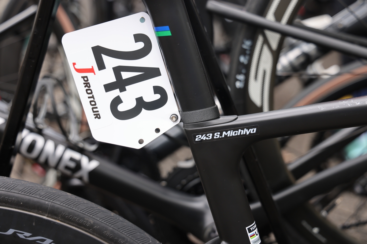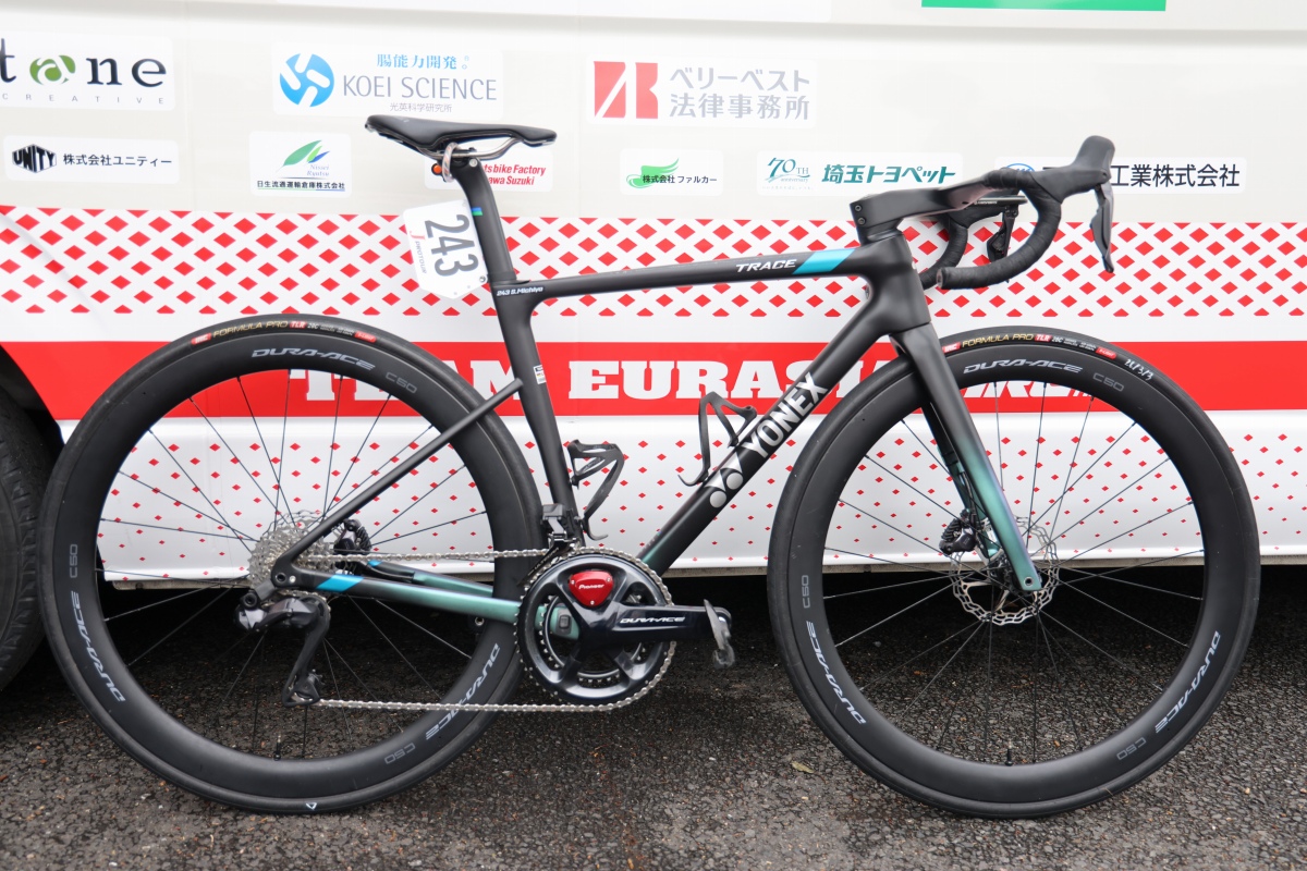 チームバイクは引き続きヨネックスだが、昨シーズンで使用していたセカンドグレードの軽量モデル「GROWENT」から、1月に発表されたばかりの新型ロードバイク「TRACE」に乗り換えている。ゼッケン243をつけるこのバイクは鈴木道也のTRACEだ。