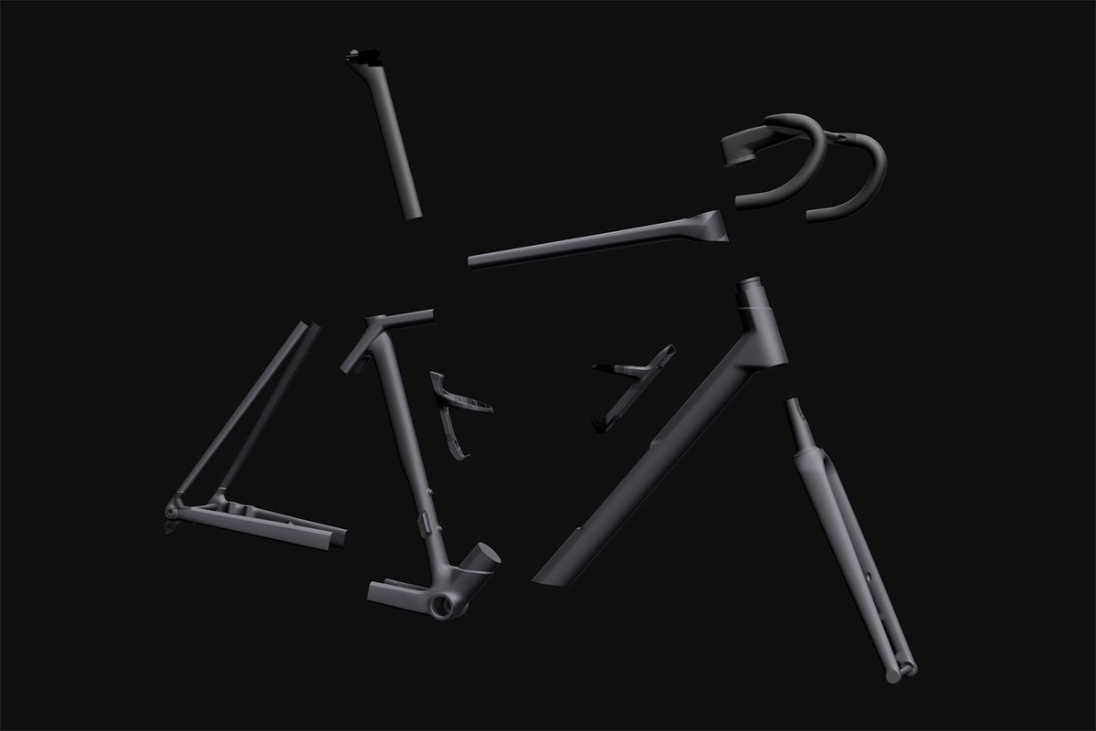 特にヘッドチューブのチューブ接合部はマルチピース構造を象徴しつつ、一体感のある造形で、近年のミニマルなエアロデザインに通じるような洗練されたデザインに仕上がっている。また、接合部をデザインとしない部分は薄いカーボンバンテージで覆うことで、モノコックのような滑らかなフレームワークを演出している。
