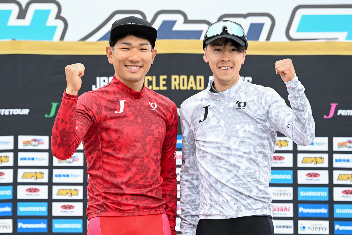 プロリーダージャージを奪回した草場啓吾(キナンレーシングチーム)とU23リーダーの島崎将男(群馬マンモスレーシング) photo:Satoru Kato