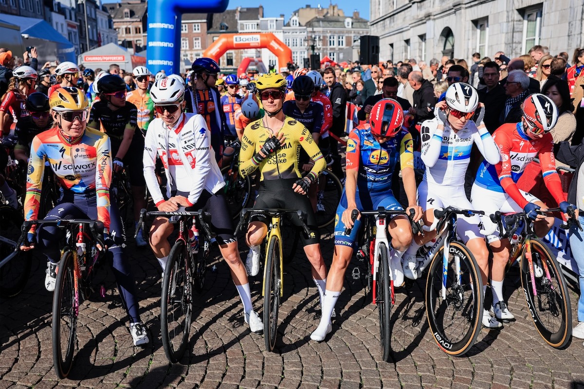 集団先頭でスタートを待つ、マリアンヌ・フォス(オランダ、ヴィスマ・リースアバイク)ら歴代優勝者たち photo:CorVos