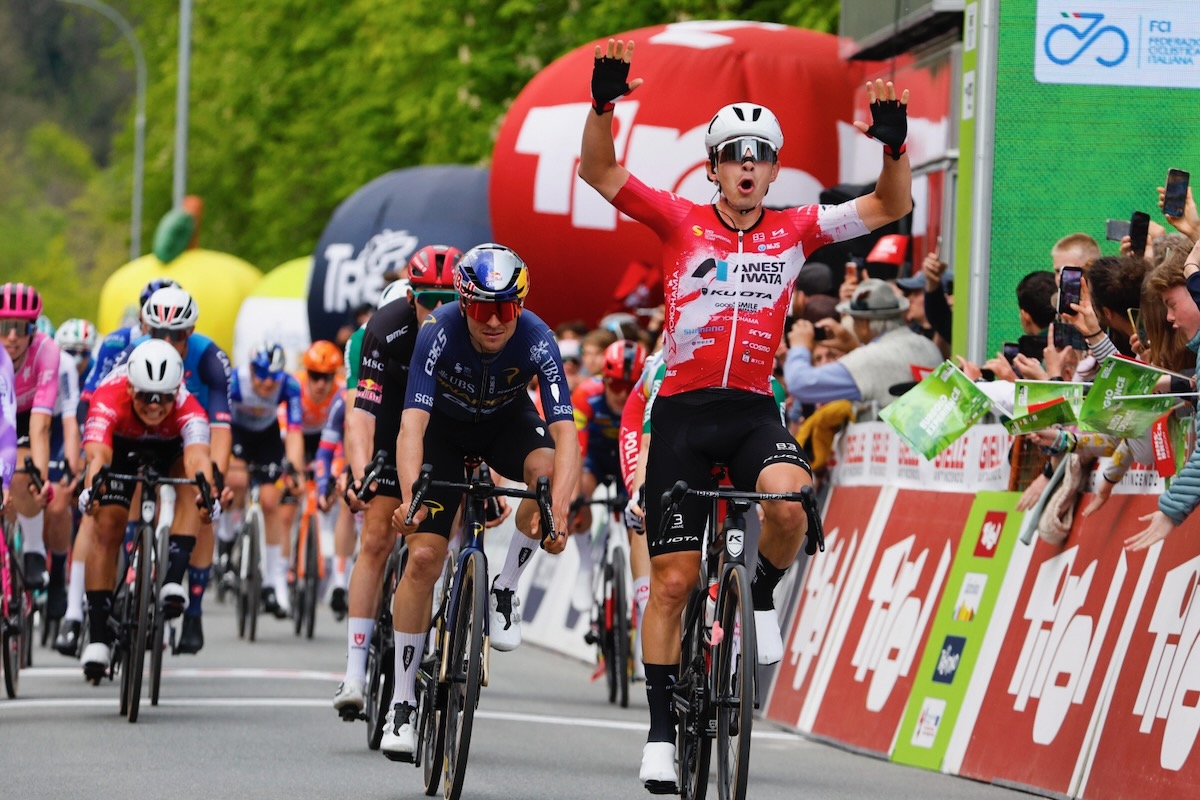 イタリアンアルプスを巡るツアー・オブ・ジ・アルプスの初日は、集団スプリントで決着。チーム右京所属の23歳トンマゾ・ダティ(イタリア)がピドコックを退け、初日勝者に輝いた。