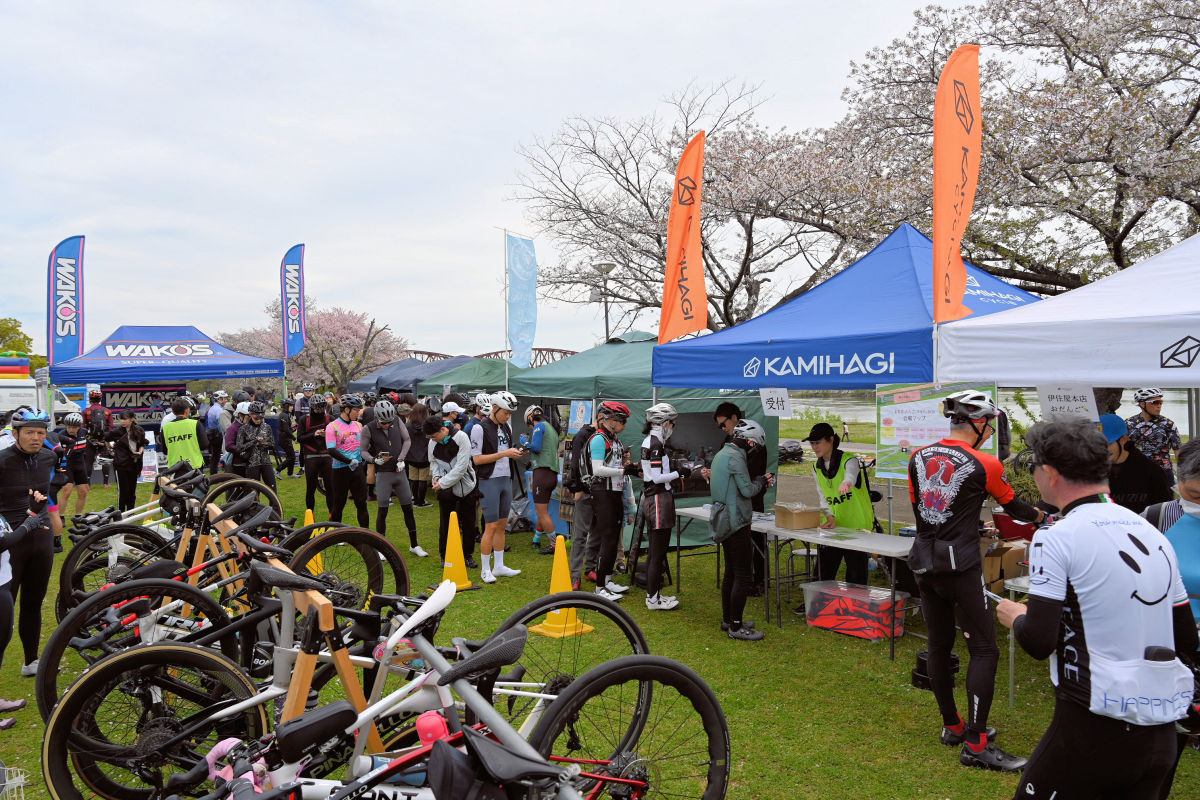 愛知県で3店舗を展開するカミハギサイクルが、4月5日に岐阜県笠松町の笠松みなと公園で「お花見、だんご、フォト。2026」を開催した。4回目の今年は、自転車メーカーや代理店等37社がブースを出展。最新バイクやホイールを最長6kmも試乗できる上、地元和菓子店の団子の振る舞いや、プロカメラマンによる桜をバックにした撮影会、抽選会と盛りだくさん。県内外からおよそ450人が集まり、サイクルショーを思わせる賑わいとなった。
