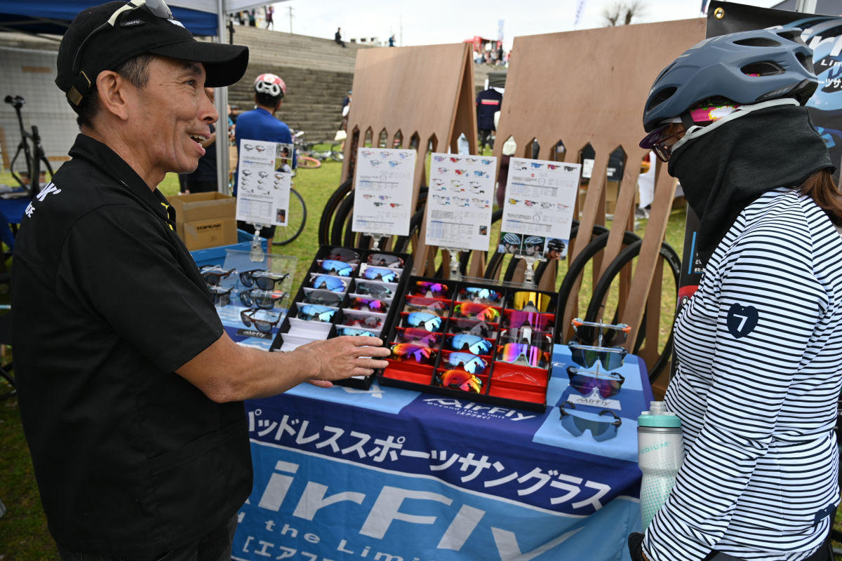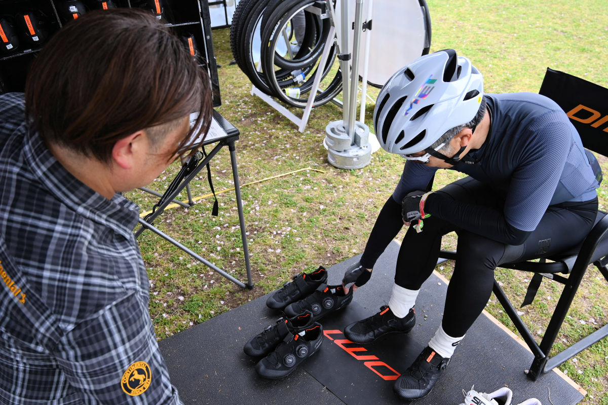 試乗だけでなく、シューズやアイウェアの試着もできた。特にシューズはサイズを履き比べられるだけでなく、メーカー担当者がアドバイスもしてくれるとあって、多くの人が気になるモデルを履き比べていた。