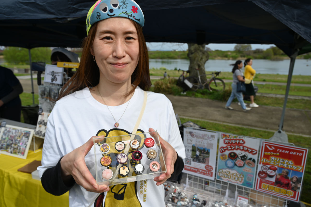 サイクルキャップや熊鈴、バーエンドキャップなどハンドメイド系のグッズを販売するブースもあった。オリジナルバーエンドを製作、販売するハンドメイド作家でサイクリストのアイラッチさんは、チームUKYOの応援グッズや、CBCテレビの番組企画でロードバイクに乗る友廣南実アナの似顔絵付きのもの、シリコン製の肉球が付いた癒やし系など、さまざまなバーエンドキャップを作って販売。1ペア2,000円もあれば買えるお手軽カスタムとして注目を集めていた。