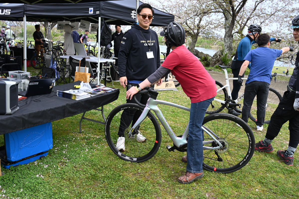 筆者は初めてこのイベントに参加したが、公園の一角に自転車ブランドなど37社のブースが並ぶ様子は、ちょっとしたサイクルショーやレースイベント会場顔負けの規模感だ。しかもピナレロやスペシャライズドといった人気ブランドも出展していて、DOGMAシリーズやS-WORKSなどのハイエンドモデルや、E-BIKEの試乗車も用意されていた。人気の試乗車は整理券が配られて希望者が順番待ちする場面も見られた。自転車だけでなく、マヴィックやゴキソなど、ホイールの試乗ができるブランドもあった。
