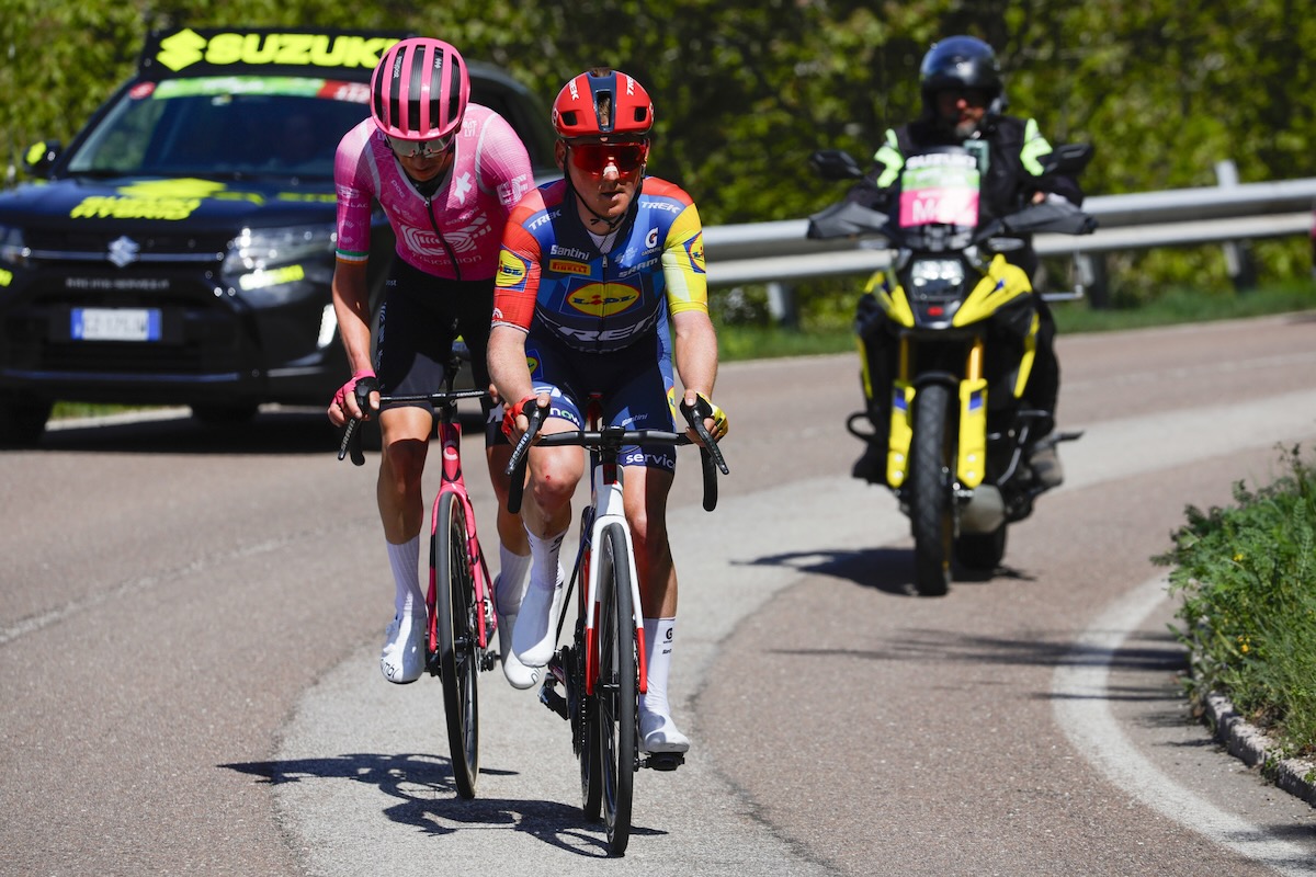 逃げ集団を形成したサム・オーメン(オランダ、リドル・トレック)とダレン・ラファーティー(アイルランド、EFエデュケーション・イージーポスト) photo:Tour of the Alps レースはニュートラルを挟んで再開され、サム・オーメン(オランダ、リドル・トレック)とダレン・ラファーティー(アイルランド、EFエデュケーション・イージーポスト)がエスケープ。それを追うメイン集団ではピナレロQ36.5プロサイクリングやレッドブル・ボーラ・ハンスグローエが牽引し、途中のアタック合戦はどれも成功しない。逃げの2名が粘りを見せ、最後の丘を越えてもなお先頭に立ち続けた。