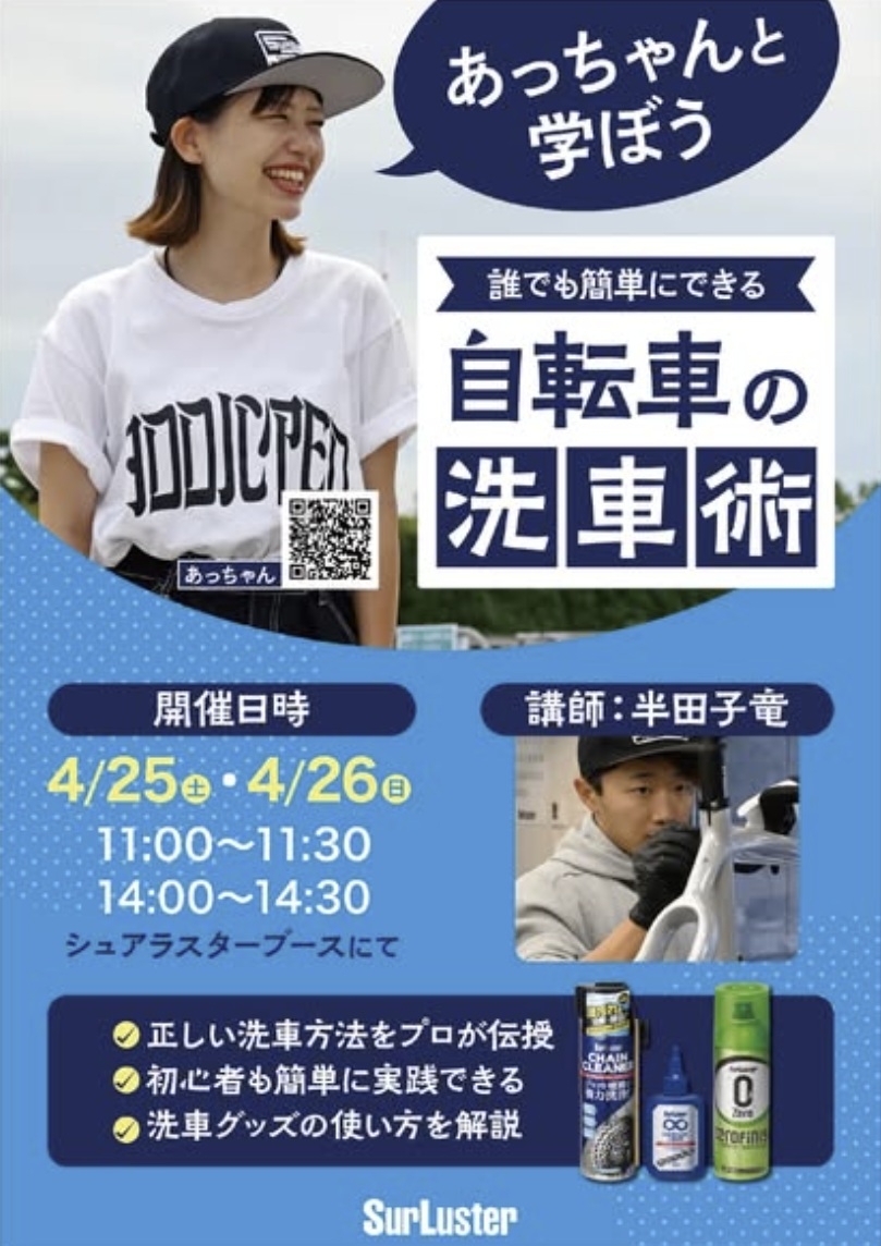 また両日ともに11時〜、14時〜に、「誰でも簡単にできる自転車の洗車術」を、