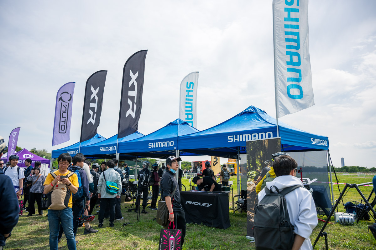 そして今年はシマノブースも復活。豊富なカラーを揃えるアイウェアや人気のシューズの試着ブースなど、いわゆるアウトフィットを中心としたブースに。そして同じくらいの熱量で展開していたのが、シマノが主催するMTBイベント「シマノバイカーズフェスティバル」のブースだ。