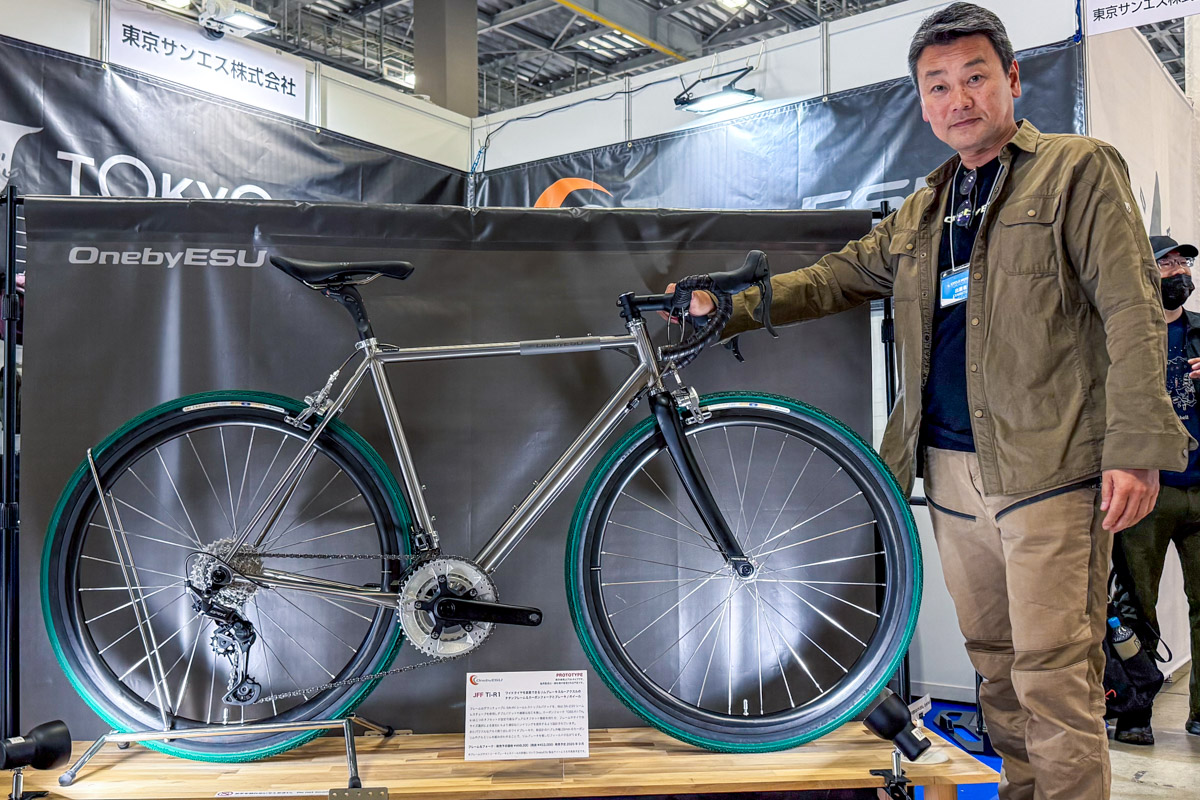 そして更にニッチを埋めていくのがわれらが東京サンエスのオリジナルブランド、ワンバイエス。既に各所で話題になっているワイドタイヤクリアランスとスルーアクスルを使用したチタンリムブレーキバイク、JFF Ti-R1の実車を展示。フレーム、フォーク、ブレーキキャリパー、リム、そしてハブに至るまで、完全に独自設計となる唯一無二のバイクに、好事家たちの目線は釘付けだ。