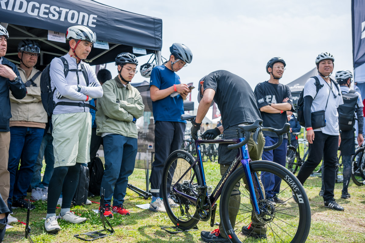 老舗のブリヂストンは渾身のエントリーロード、RE6を前面に。バイシクルオブザイヤーで「ファーストロードバイク賞」を獲得したこともあり、がぜん注目が集まる一台だ。実際、ブースには食い入るようにバイクを見つめる方もたくさん。