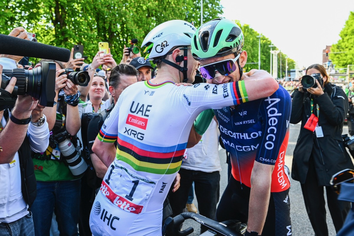 セクサスと抱擁するタデイ・ポガチャル(スロベニア、UAEチームエミレーツXRG) photo:CorVos