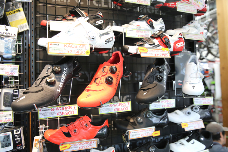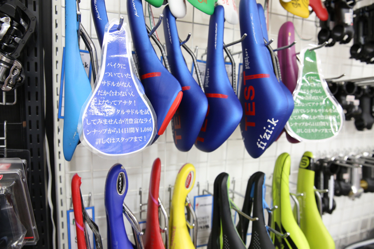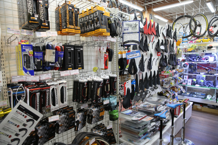 北浦和スズキ全店舗に共通する特徴が、フィッティングを重視し、それらに関係するアイテムやパーツ類を多く揃え、しかも実際に試せること。例えばステムやハンドル、サドル類は各ブランドの各サイズが豊富で、シマノに統一されてしまいがちなペダルもルック、スピードプレイやタイムなどがあらかた在庫されているのだ。