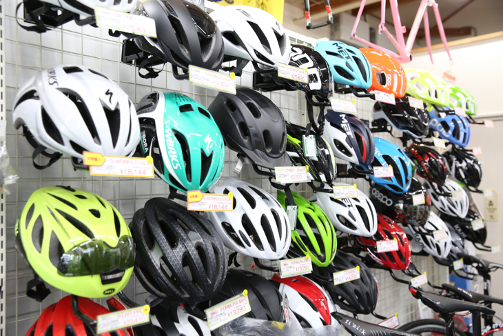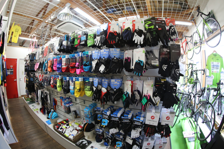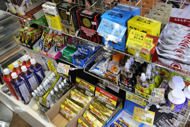 「高価なパーツでも実際に手に取って見てもらいたい」との思いからほとんどの商品は飾り箱から出して陳列され、ガラスケース内のパーツでも手に取って見ることができる。ここ最近はトライアスロンにも力を入れているので、ランニングシューズなどソフトグッズも用意されていて、補給食の種類は数豊富。
