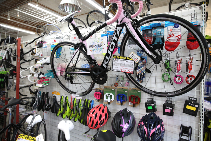 荒川サイクリングロードなどが近いことから、北浦和スズキではロードバイクを中心にした商品ラインナップを行っており、加えてビギナーから人気の高いクロスバイクや、シクロクロスバイクの姿も。常に40台ほどを店頭に並べ、試乗車が多く揃えられていることもユーザーフレンドリーだ。
