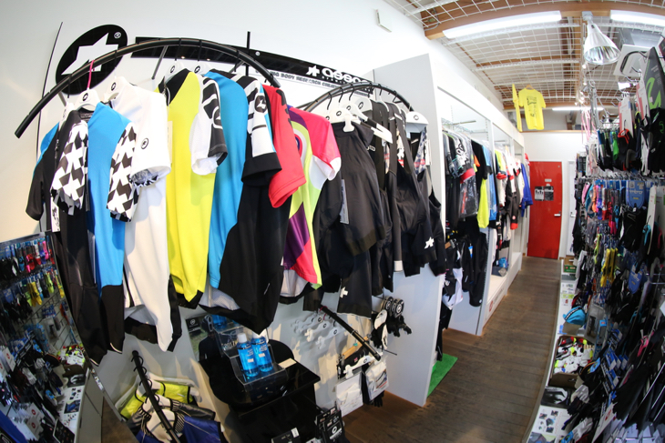 アパレル類が豊富に用意されていることも北浦和スズキの良いところ。店内奥の販売スペースは2面を使って各種ジャージなどが並べられており、その中心となるのはアソスやピセイ、カステリなどハイセンスなブランドたち。ショップの歴代オリジナルジャージは全てピセイにこだわっていて、アクセサリーや女性用の商品数も豊富。試着ルームも完備されるなどその充実ぶりは、中規模のショップながら大型店と肩を並べるほどだ。