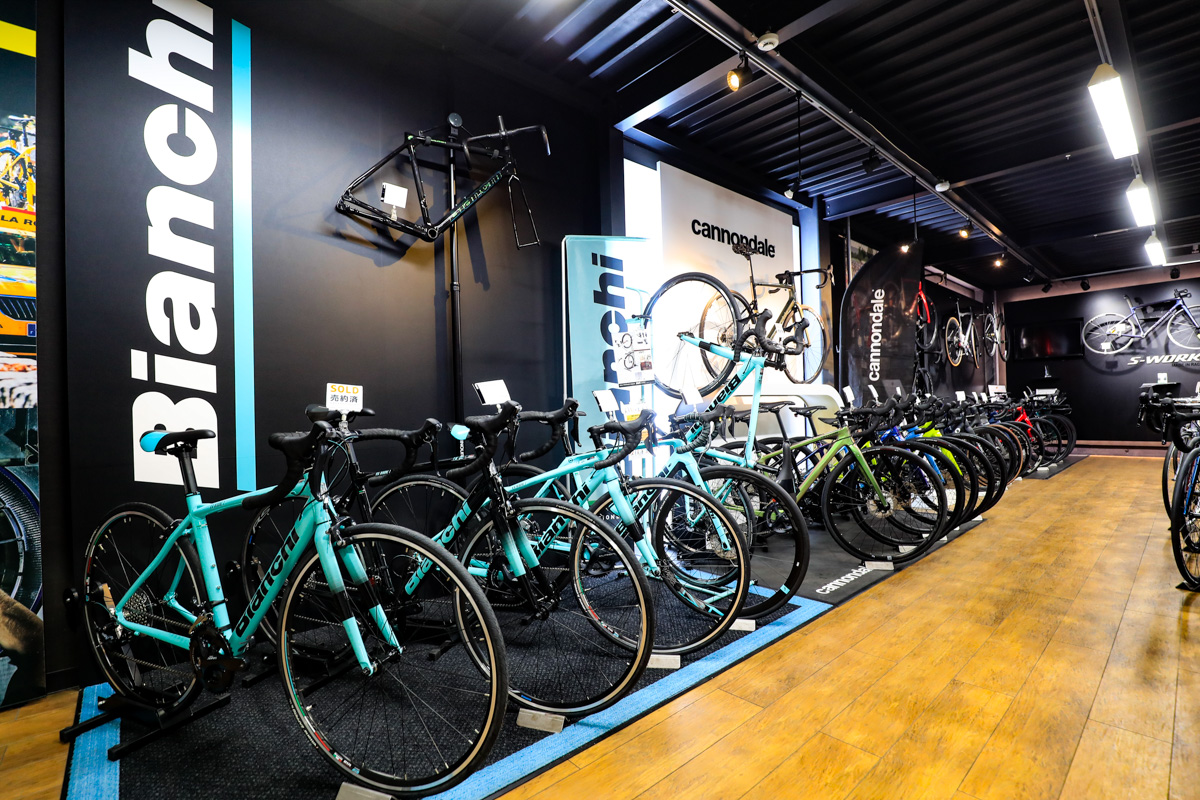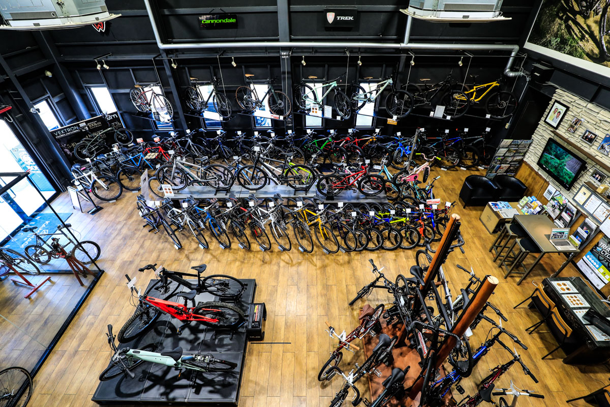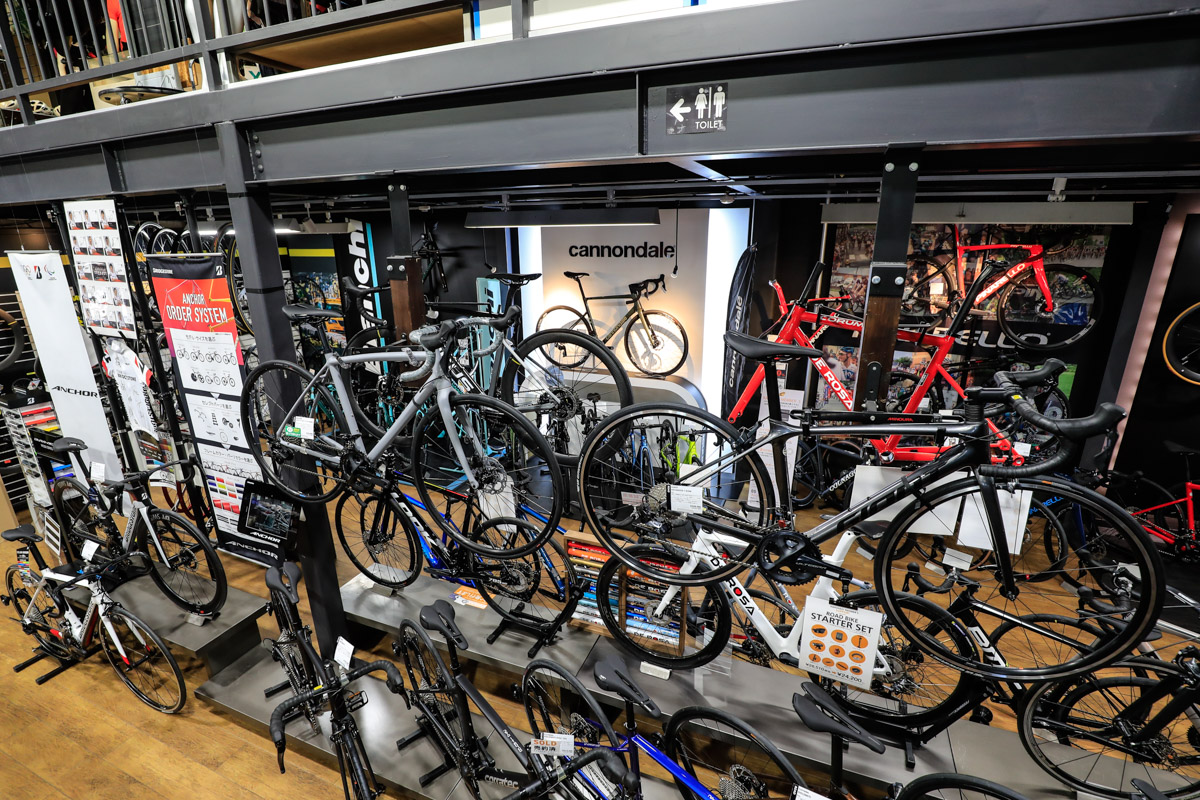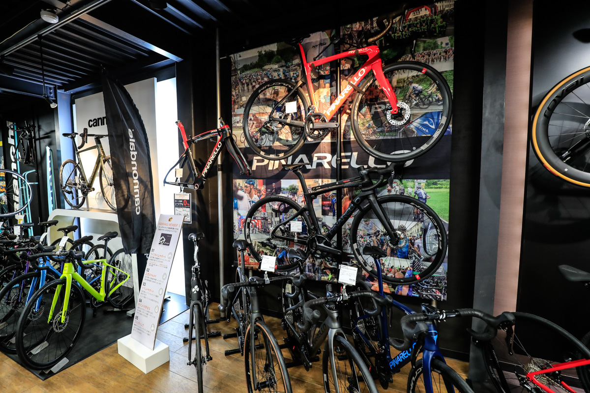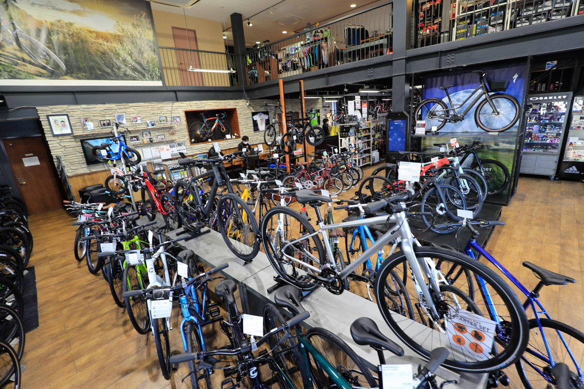 ショップの扉をくぐって店内に進むと、まず目に飛び込んでくるのは1階フロアにズラリと並んだロードバイク、MTB、クロスバイクの数々。トレックやキャノンデール、スペシャライズド、ジャイアント、ピナレロ、コルナゴ、ビアンキ、デローザ、BMC、ルック、コナなど世界の有名ブランドが揃う。